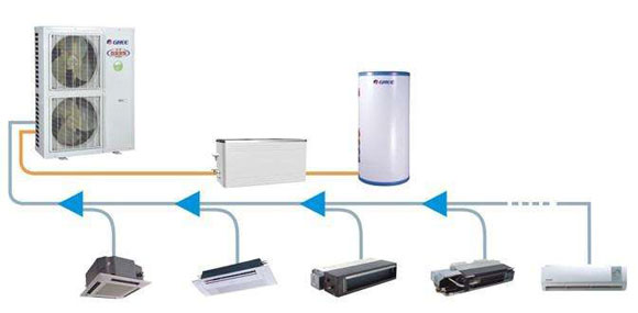 這種系統一般可由一臺室外機和4~16臺室內機組成。低檔次的是一拖四的熱泵型空調機。高檔次的配有由直流變速電動機驅動的密封型雙轉子壓縮機,也有用渦旋式壓縮機的,室內機采用電子膨脹閥,具有可同時供熱、供冷、熱回收功能的系統。其優點是各居室溫度可個別調節,另外制冷劑液體管和氣體管的直徑小、管路占用的空間小。